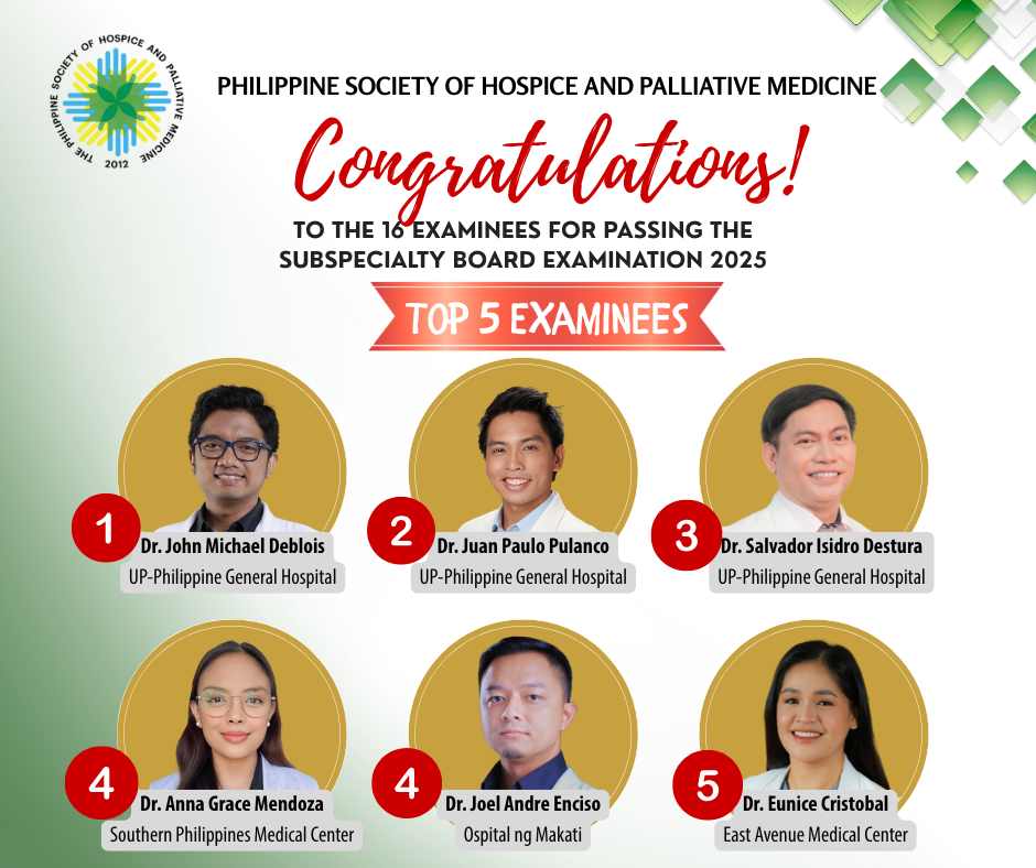 The Philippine Society of Hospice and Palliative Medicine (PSHPM) is delighted to extend its warmest congratulations to the sixteen (16) physicians who successfully passed the most recent Subspecialty Board Examination held last September 6, 2025.