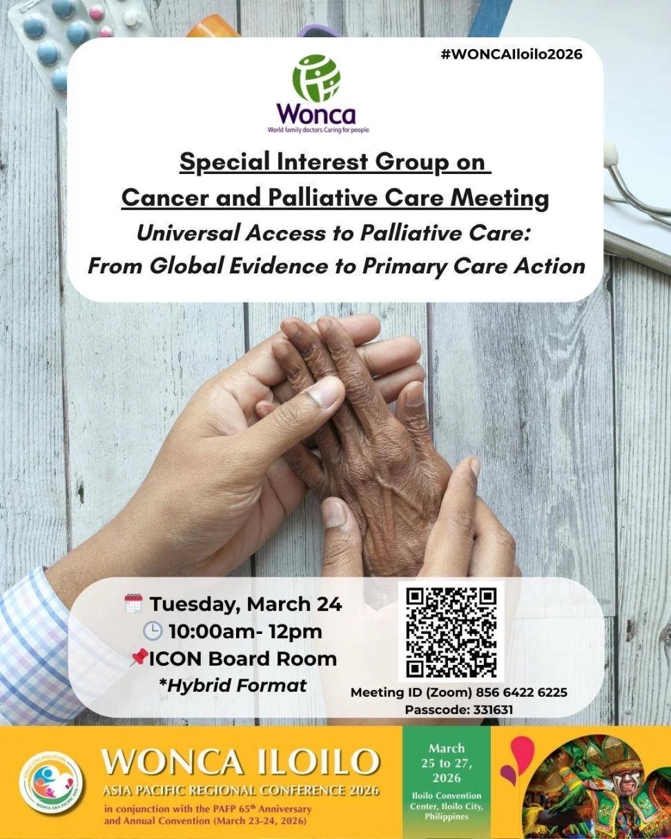 The Special Interest Group on Cancer and Palliative Care Meeting brings together clinicians, educators, and advocates to explore how global evidence can be translated into practical, primary care–based solutions. Centered on the theme “Universal Access to Palliative Care: From Global Evidence to Primary Care Action,” this session highlights the vital role of family physicians in delivering holistic, patient-centered care across the illness trajectory.